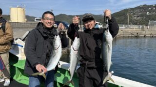 ルアー メジロ70cm級3匹 森木氏 賀来氏 カワハギ6匹 渡辺氏 磯メジロ70cm級2匹 岩川氏 グレ42cm頭に カワハギ 新川氏 グレ40cm 中尾氏 グレ30cm頭に チヌ カワハギ 塚本氏