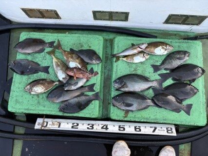 11月8日 スマ鰹 グレ イガミ シイラ カワハギ アイゴ 平スズキ ルアー 2025.11.08 目次 沖一文字ルアー磯 沖一文字 グレ40cm2匹 スマ鰹 イサギ 永岡氏 ルアー シイラ68cm スマ鰹 関谷氏 スマ鰹 磯でスマ鰹 磯 グレ42cm頭に ヒラスズキ イサギ カワハギ 藤森氏 グレ32cm頭に イサギ 平松氏 グレ38cm頭に イサギ カワハギ 瀧川氏 グレ35cm頭に サンバソウ イガミ 池端氏 グレ35cm頭に アイゴ イサギ 新川氏 イガミ40cm頭に10匹以上 イシガキ 深谷氏